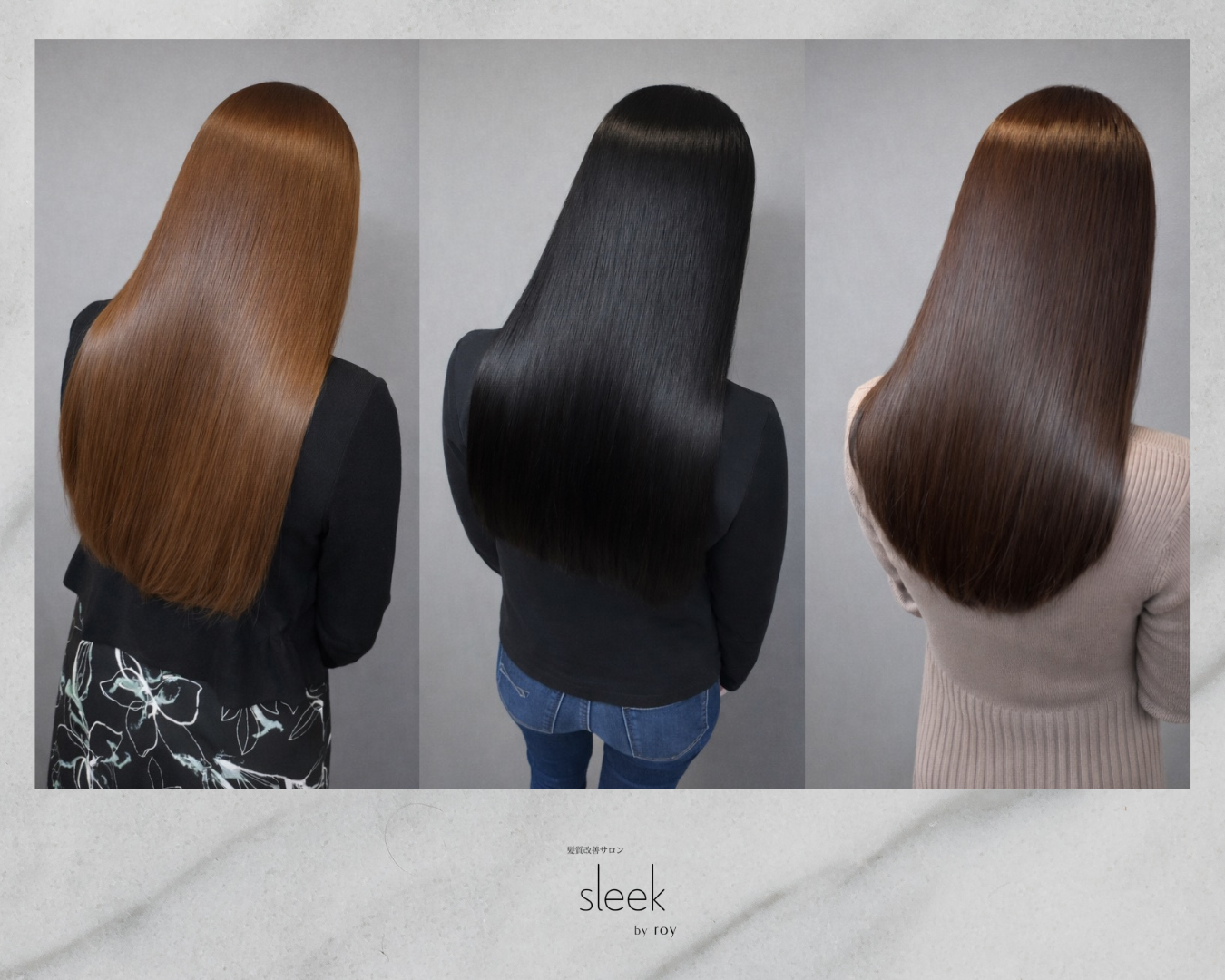 当店では、髪質やお悩みに合わせて専門的な薬剤と高い技術を駆使した施術をしています。施術を重ねるたびに、指通りなめらかで扱いやすい美しい髪をご実感いただけます。sleekでしかできない施術工程にしております。